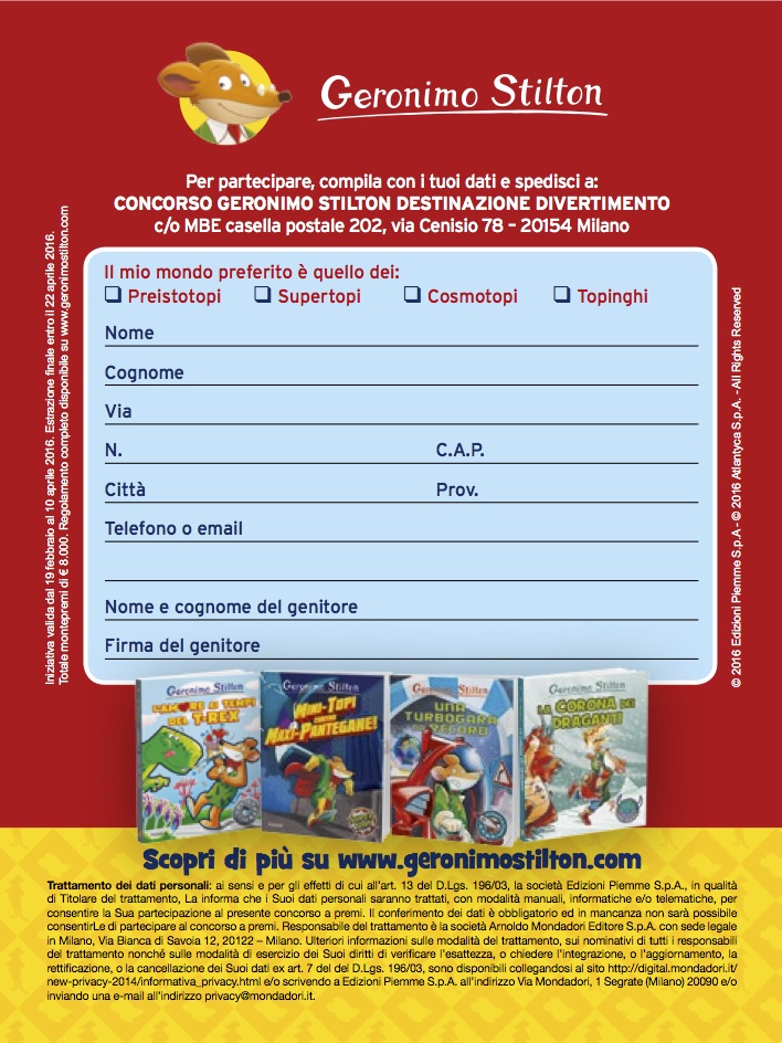 Come, non conoscete il mio concorso “Destinazione Divertimento”? Partecipare è semplicissimo, cari topini e topette: basta fare il TEST che trovate qui per scoprire che tipo di topo siete e, una volta fatto il test, compilare la cartolina con i vostri dati e spedirla all’indirizzo: