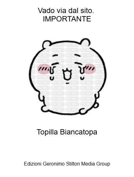 Topilla, quanto mi mancherai!!!😭😭😭😭😭😭😭😭😭😭😭Capisco e rispetto la tua scelta, è vero che ultimamente non ci sono praticamente più nuovi libri da leggere e spero che prima o poi riprenderà ad essere pieno di storie stratopiche come prima. Mi dispiace un sacco che tu te ne vada,mi mancheranno i tuoi libri, il tuo topavatar,il tuo "ciaone", insomma, un po' tutto, ma tu devi fare quello che ti rende felice e se questo è quello che vuoi allora è giusto così. Ti faccio un grandissimo in bocca al lupo per la tua carriera da cantante,e spero che in qualche modo ti riconoscerò quando diventerai famosa. A questo punto anch'io ti faccio un ultimo saluto: ciao dolcissima Topilla Biancatopa, sei stata una BFF fantastica e spero che tutti i tuoi sogni possano realizzarsi💖💖💖💖💖💖💖💖💖💖💖💖💖💖💖💖💖