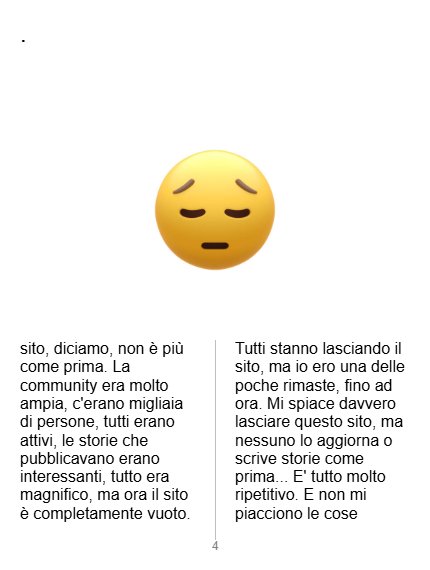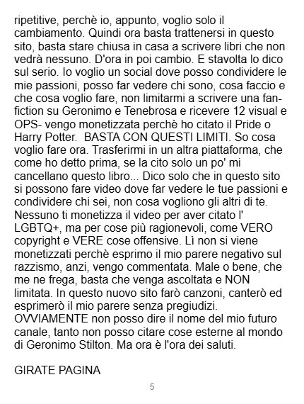 Nooooooo Topilla😭😭😭Ripensaci!!!! Eri rimasta solo tu!😭😭😭 Mi mancherai tantissimo, il sito sarà completamente diverso senza te😭 Sappi comunque che se ti verrà l'idea di scrivere altri libri io li leggerò e li commenterò!!! Spero che ti farà piacere