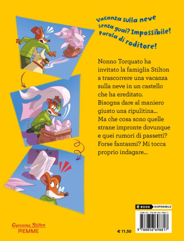 Nonno Torquato ha invitato la famiglia Stilton a trascorrere una vacanza sulla neve in un castello che ha ereditato. Bisogna dare al maniero giusto una ripulitina... Ma che cosa sono quelle strane impronte dovunque e quei rumori di passetti? Forse fantasmi? Mi tocca proprio indagare...